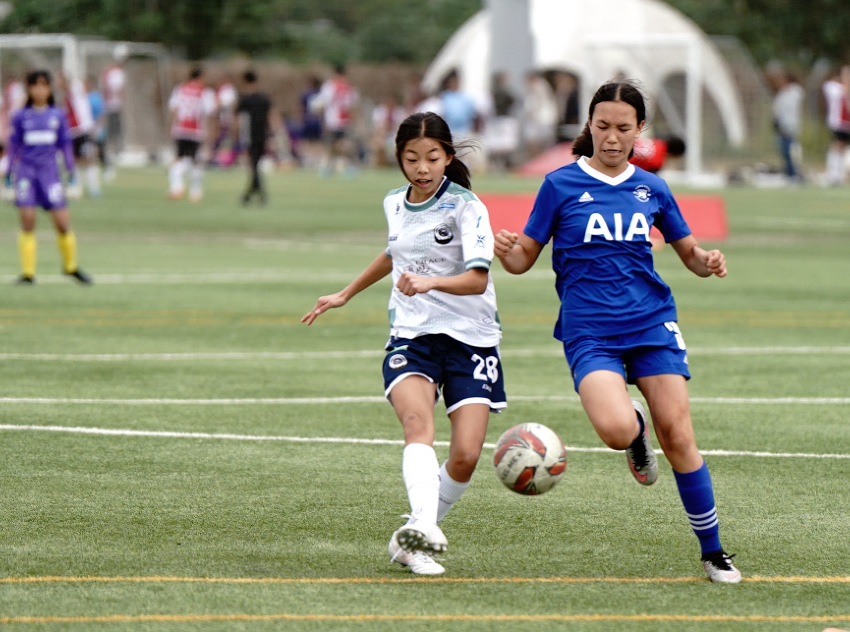 Chua Emma Jian Yi and Winmill Charlotte Elizabeth May also came close with their angled shots that narrowly missed the target, keeping Grace Citizen at bay. Just before halftime, Lucky Mile had a flurry of golden opportunities. Firstly, Moi Lei Ngai (Leah)'s long-range strike was brilliantly parried by the goalkeeper, and then QIAO NORA's close-range attempt from Moi Lei Ngai (Leah)'s corner kick was denied by the goalkeeper's fingertips. As the first half concluded, Lukcy Mile maintained their slim 1:0 advantage over Grace Citizen.